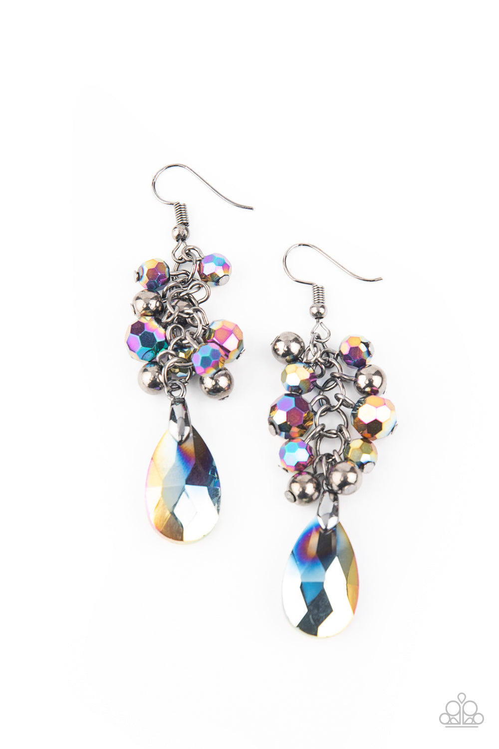 An array of metallic oil spill crystal-like beads and shiny gunmetal beads trickles along a lengthened gunmetal chain, giving way to a matching oil spill crystal-like teardrop for a dramatic chandelier effect. Earring attaches to a standard fishhook fitting.