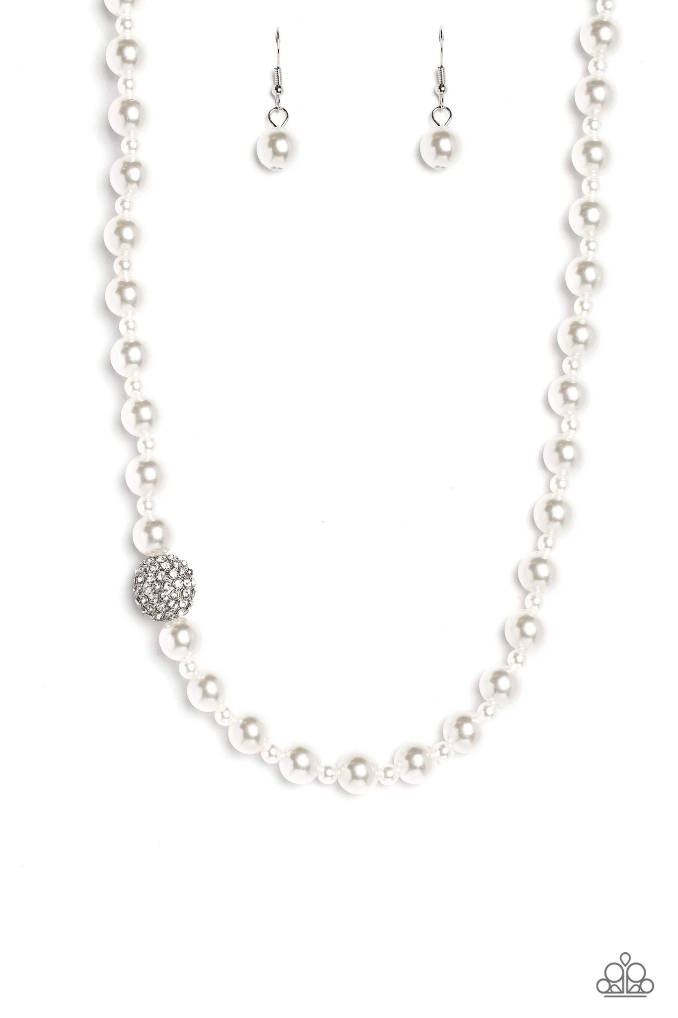 Strung along the entirety of an invisible wire, classic white pearls in varying sizes coalesce down the neckline for a refined finish. Adding to the elegant design, a sparkly white rhinestone-encrusted silver ornament shimmers amongst the sea of pearls. Features an adjustable clasp closure.