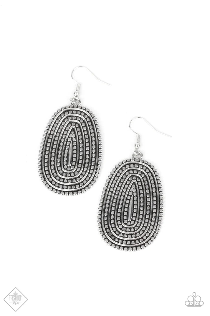 Rows of antiqued silver dotted texture radiate outward from an embossed center. The concentric lines create a rippling effect across the frame resulting in a rustic finish. The earring attaches to a standard fishhook fitting.