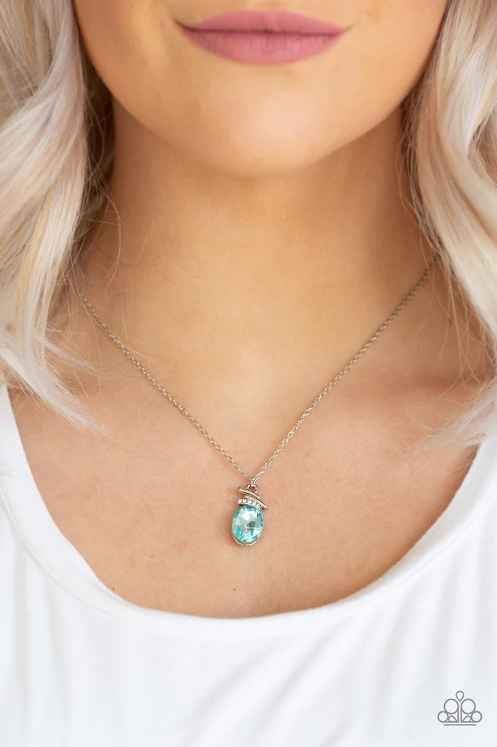 An oval blue rhinestone swings from the bottom of stacked silver frames, creating a dramatic pendant below the collar. Dainty white rhinestones dance along the lowermost frame for a timeless finish. Features an adjustable clasp closure.