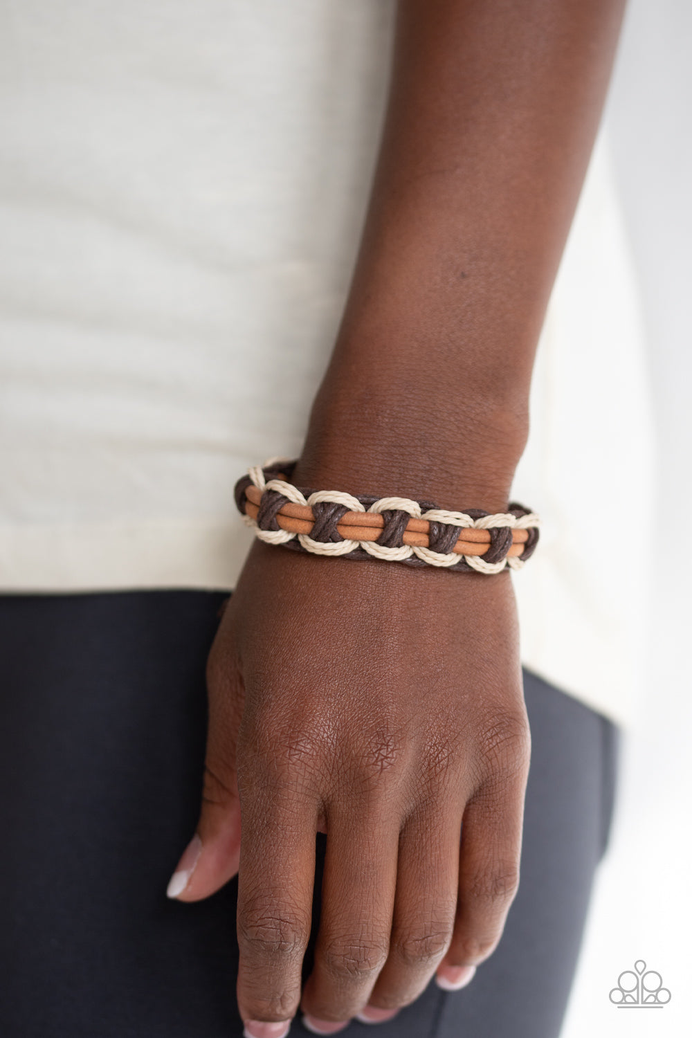 Strands of white and brown cording ornately weave around brown leather cords, creating an earthy braid. Features an adjustable sliding knot closure.