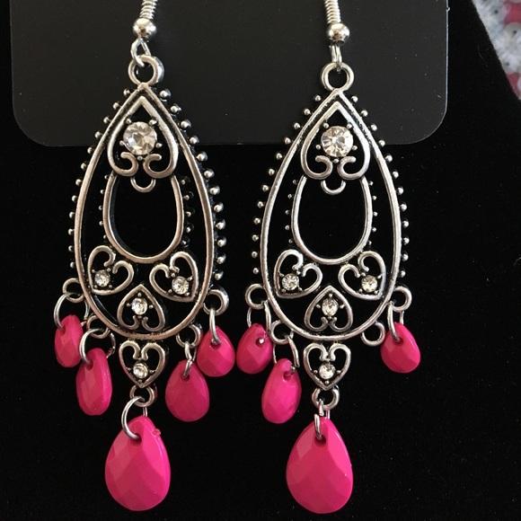 Radiating with white rhinestone centers, shimmery silver heart frames climb a silver teardrop, creating a whimsical lure. Faceted red teardrops swing from the bottom, adding a flirty fringe to the playful palette. Earring attaches to a standard fishhook fitting.