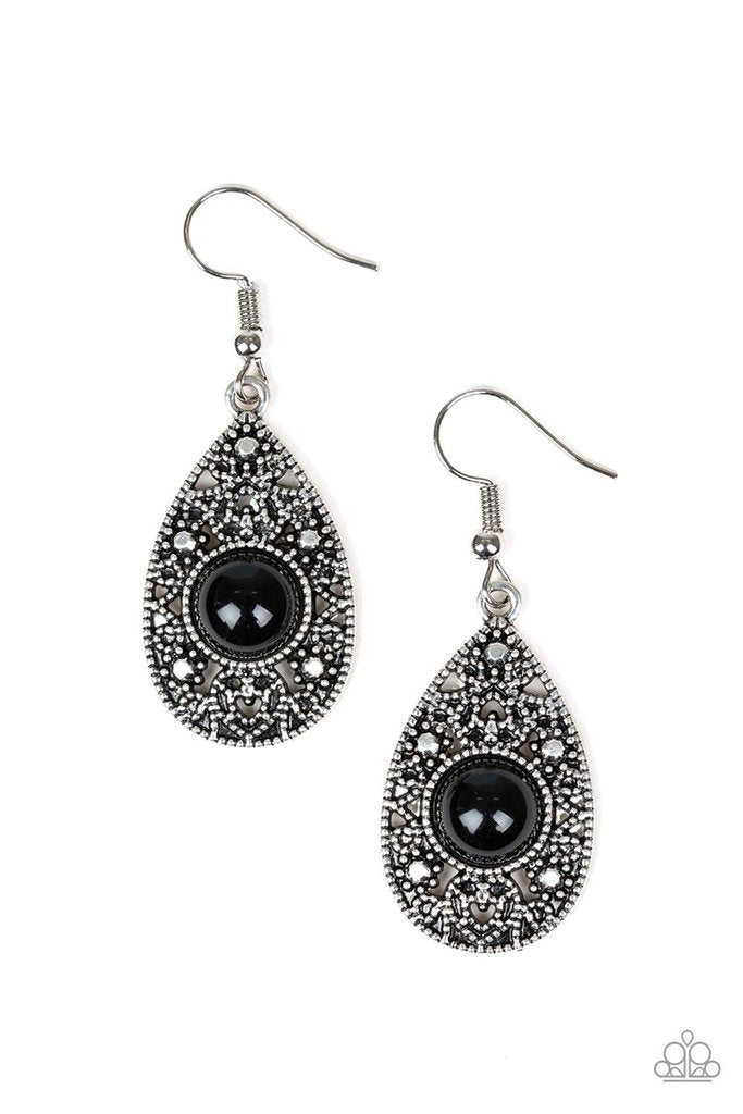 A shiny black bead is pressed into the center of a silver studded teardrop frame for a perfect pop of color. Earring attaches to a standard fishhook fitting.