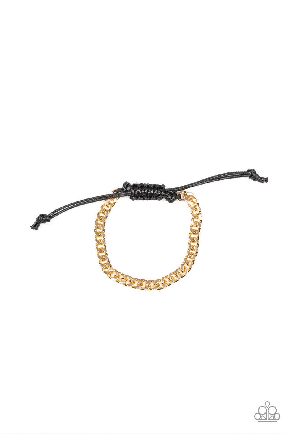 Shiny black cording knots around the ends of a gold beveled curb chain that is wrapped across the top of the wrist for a versatile look. Features an adjustable sliding knot closure.