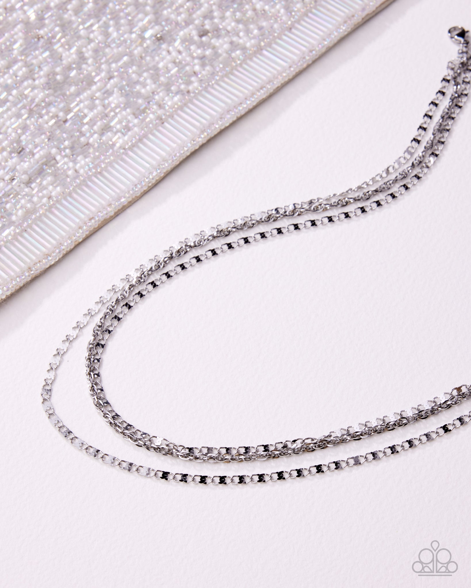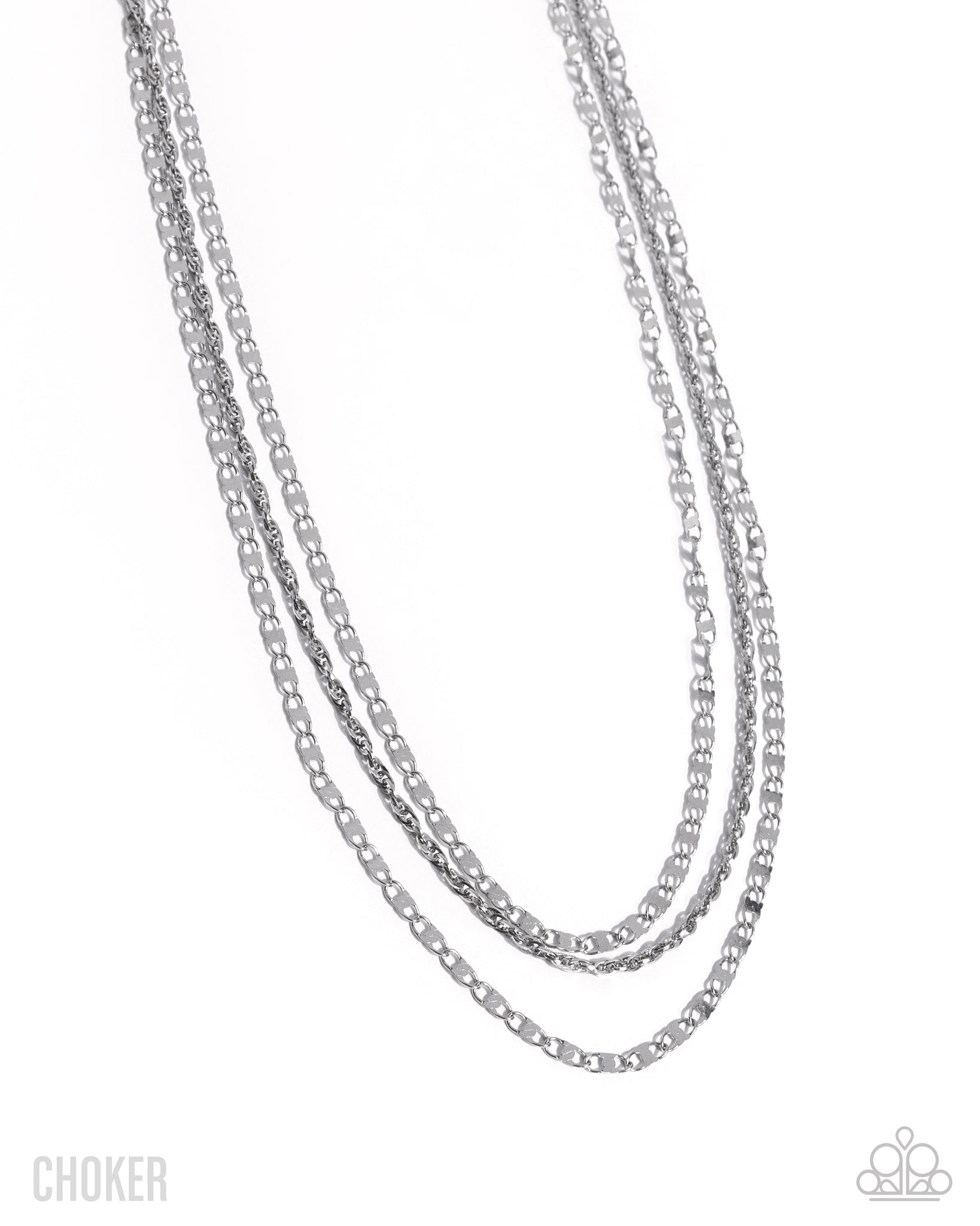 Featuring stainless steel, a trio of glistening silver mismatched chains cascades and layers along the collar for an industrial, iconic display. Features an adjustable clasp closure.