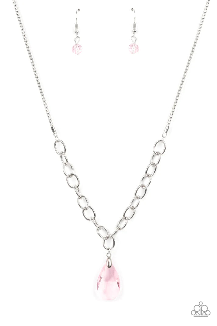 A glassy pink teardrop swings from the bottom of a chunky silver chain that attaches to a shimmery silver popcorn chain, creating a modern display below the collar. Features an adjustable clasp closure.