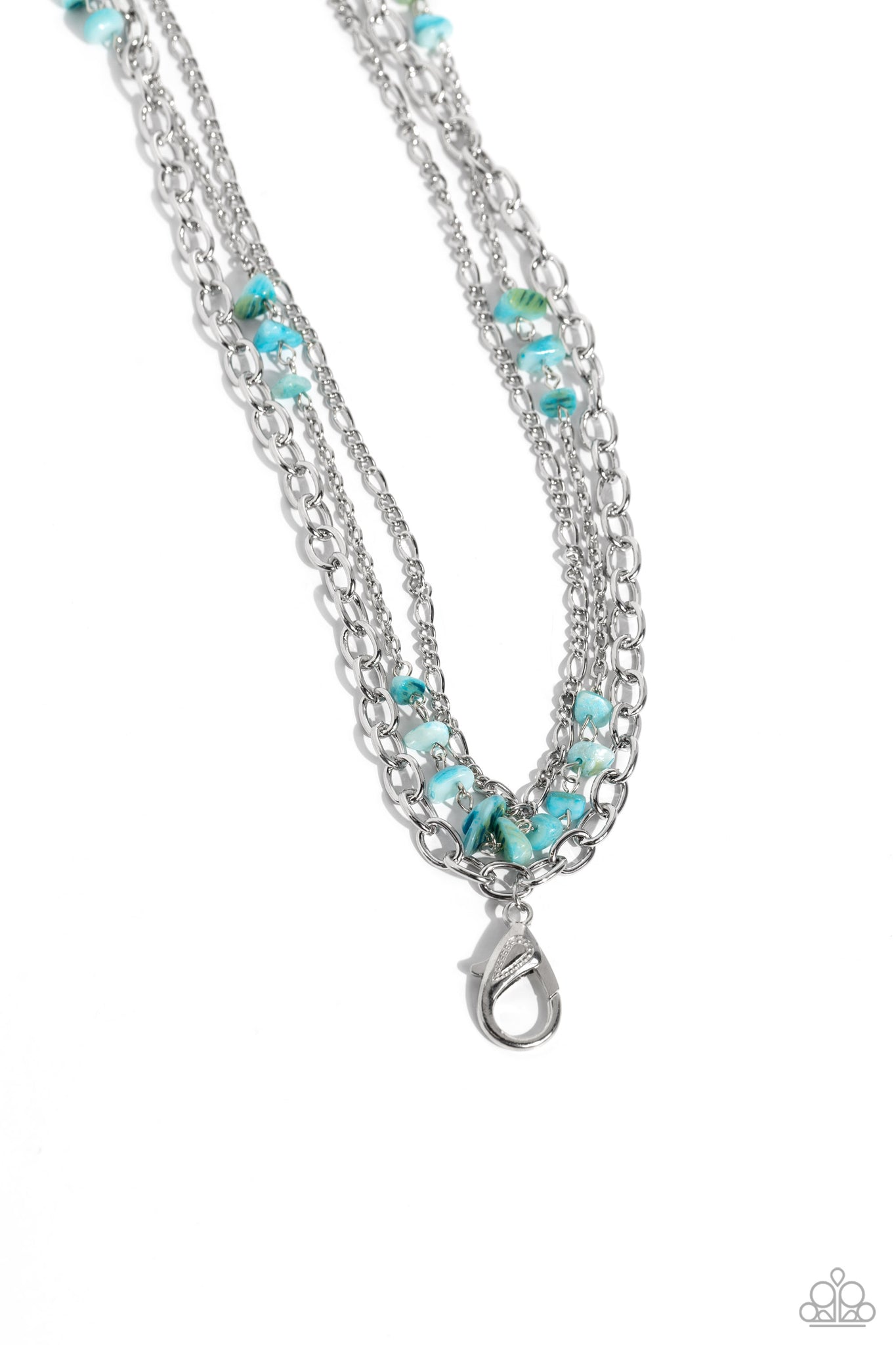 Featuring refreshing, chiseled turquoise shell-like beads, mismatched silver chains layer down the chest for a seasonal look. A lobster clasp hangs from the bottom of the design to allow a name badge or other item to be attached. Features an adjustable clasp closure.