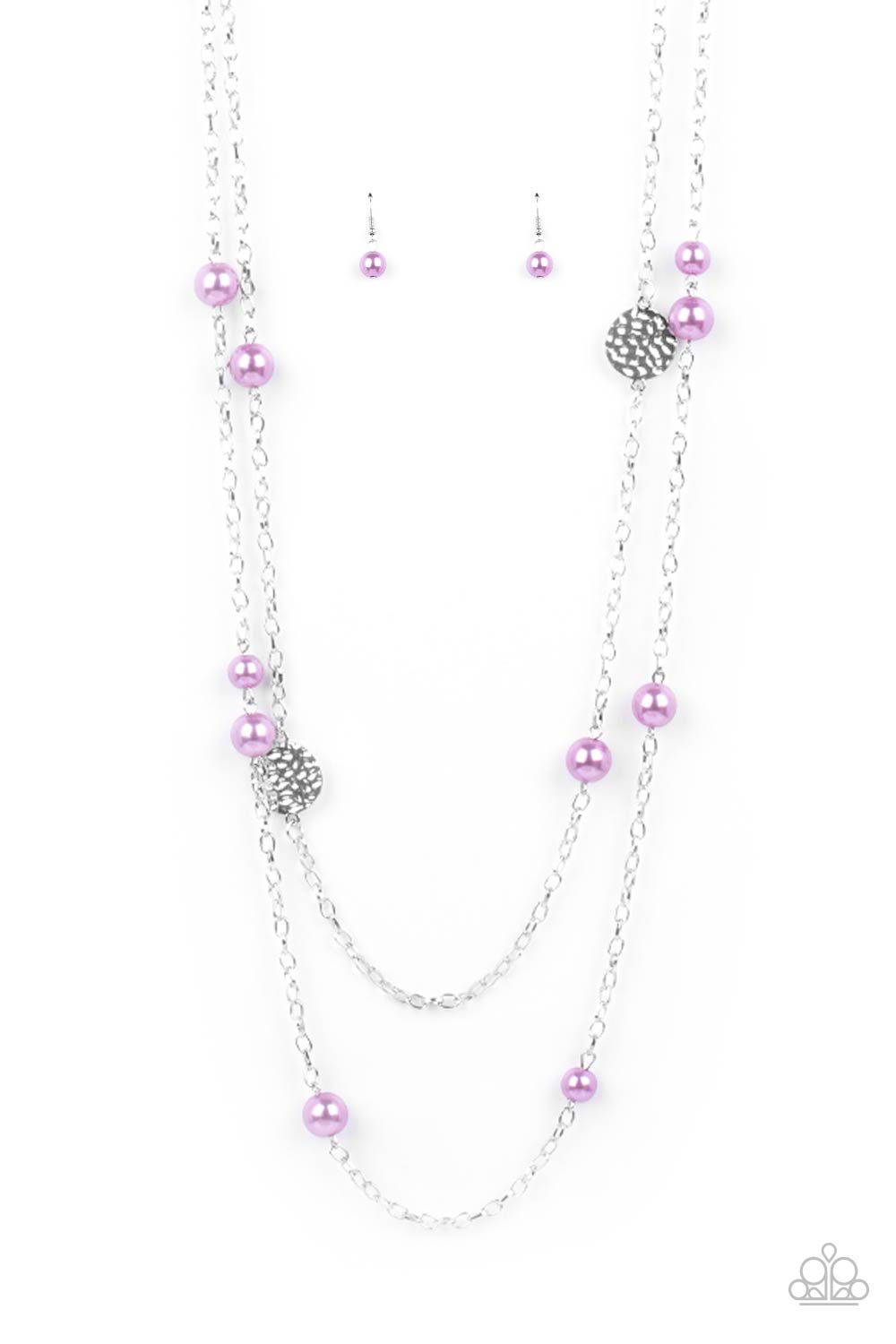 Double strands of lengthened silver chains are adorned with soft purple pearls. Three shiny hammered silver discs create bold asymmetrical accents for an eye-catching finish. Features an adjustable clasp closure.