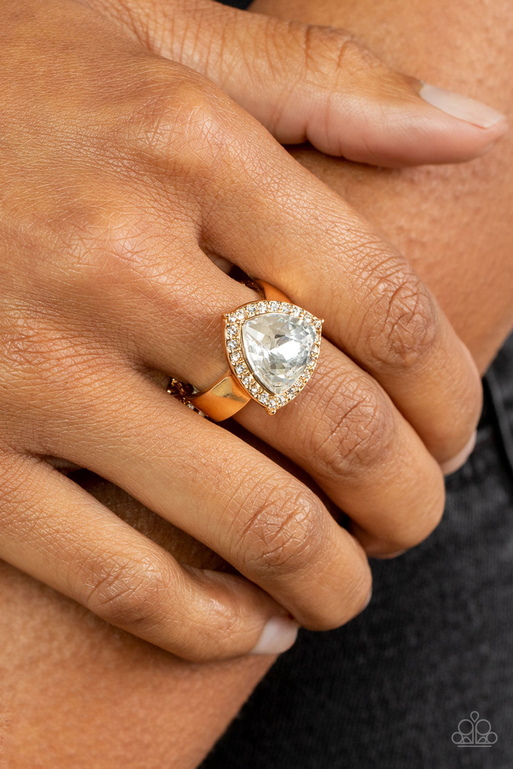 An oversized trilliant cut white rhinestone encased in a sparkling rhinestone-encrusted gold frame steals the spotlight and creates an eye-catching stunner atop the finger. Features a dainty stretchy band for a flexible fit.