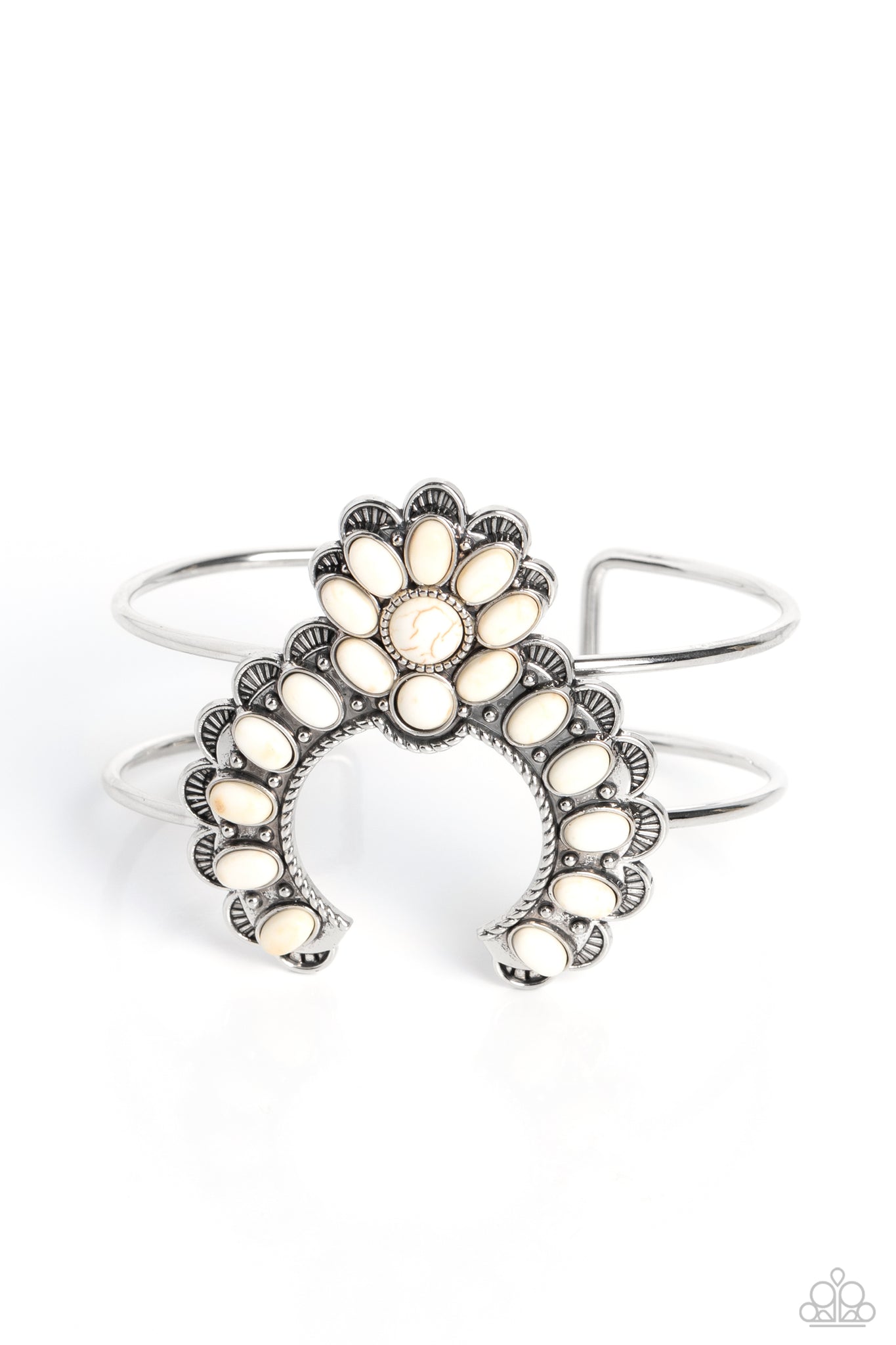 Featured in the center of an airy silver cuff, an opulent, silver southwestern-inspired frame elongates up the wrist. White stones, encased in the textured frame that features flared edges with airy scalloped cutouts, and a textured rope-like detail add an earthy pop of color to the design. As the stone elements in this piece are natural, some color variation is normal.