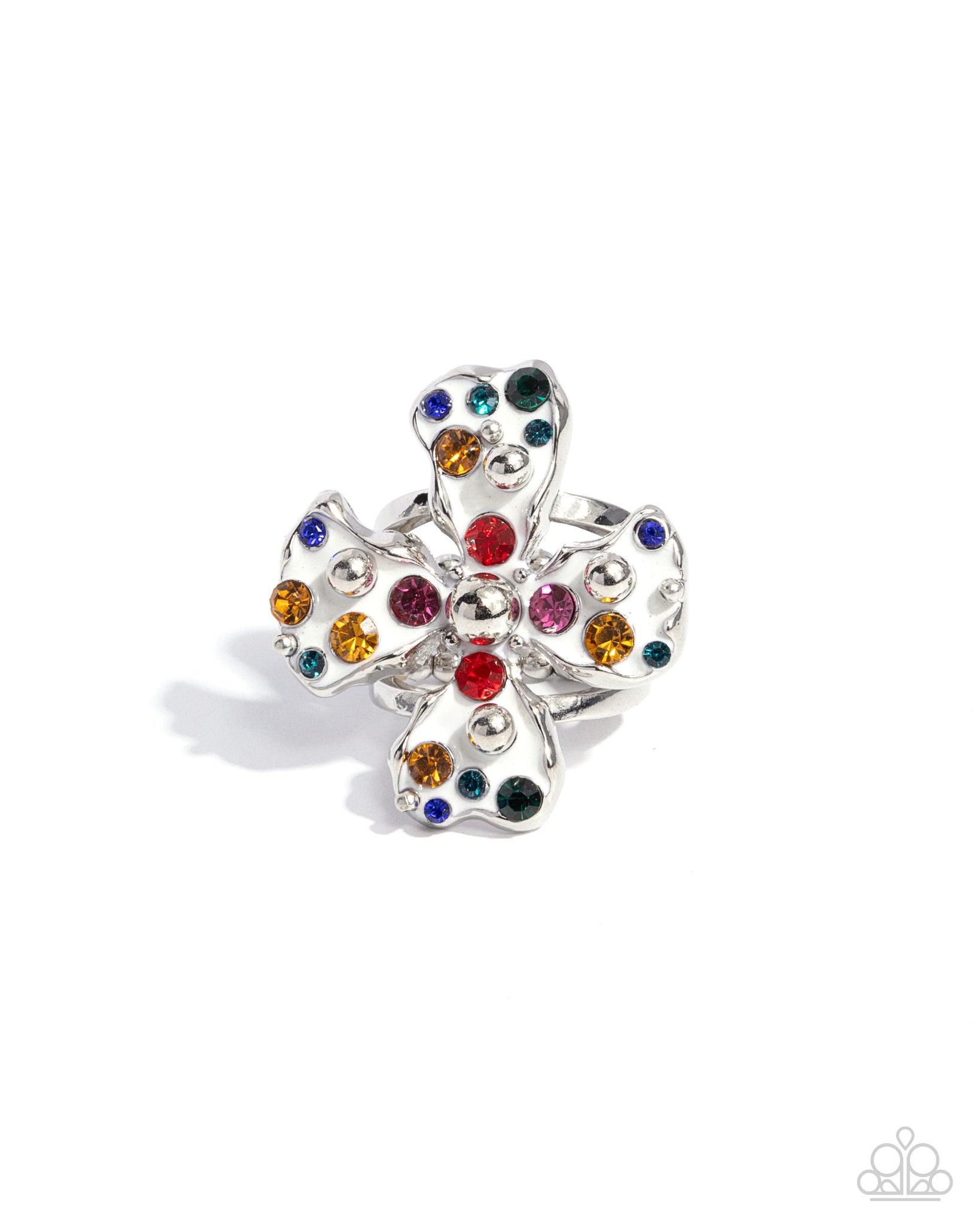 A shiny silver floral frame, coated in a white paint finish, is adorned with a stunning array of colorful rhinestones. The bold mix of colors creates a playful and eye-catching design. Features a stretchy band for a flexible fit.
