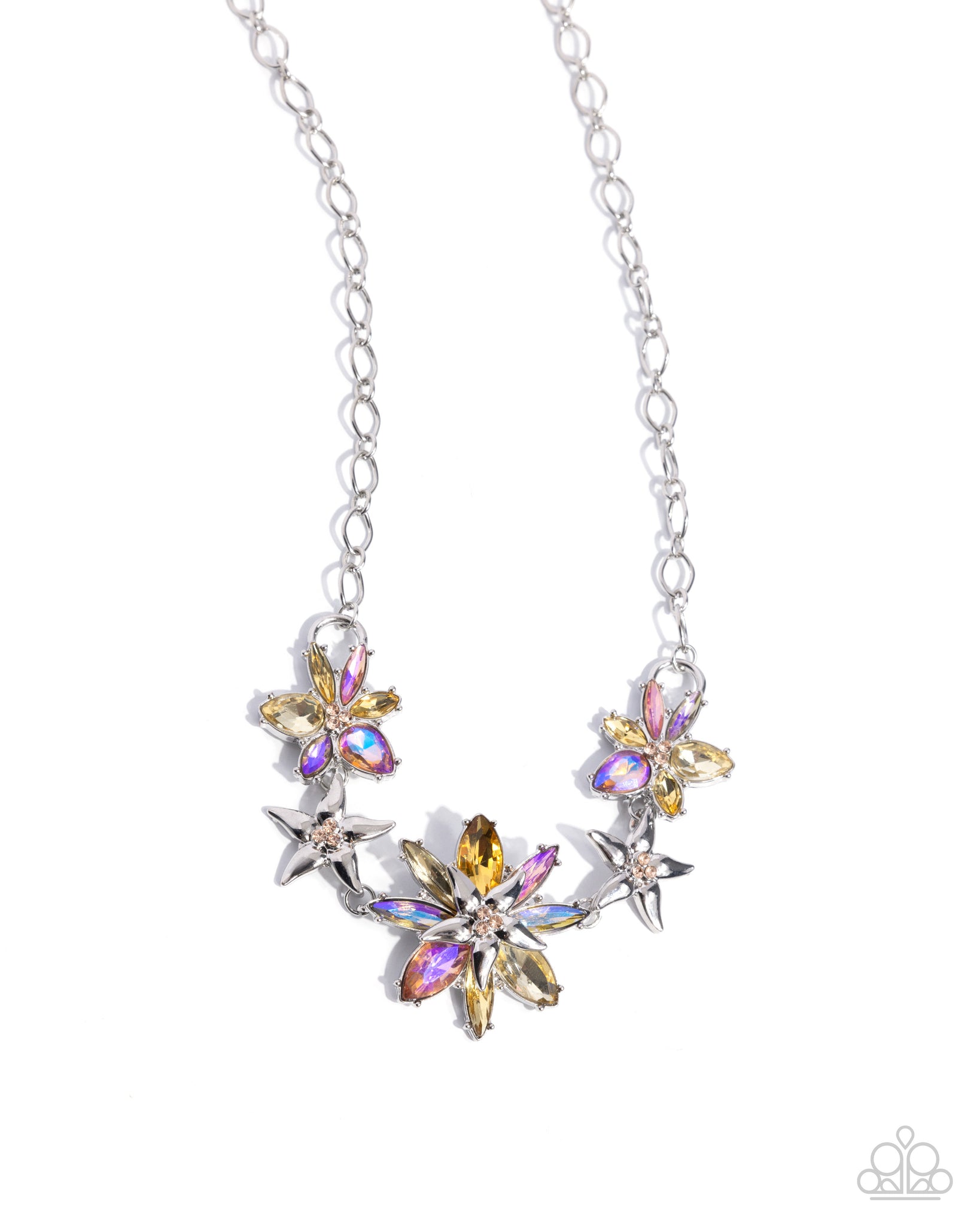 Featuring a three-dimensional effect, a collection of yellow multicolored and yellow UV-shimmery gem flowers made up of marquise-cut and teardrop silver-pronged petals blooms from a trio of light peach rhinestones in varying sizes, alternating with tilted silver flowers with similar shimmery centerpieces below the neckline along an abstract silver chain for a fantastically floral look. Features an adjustable clasp closure.