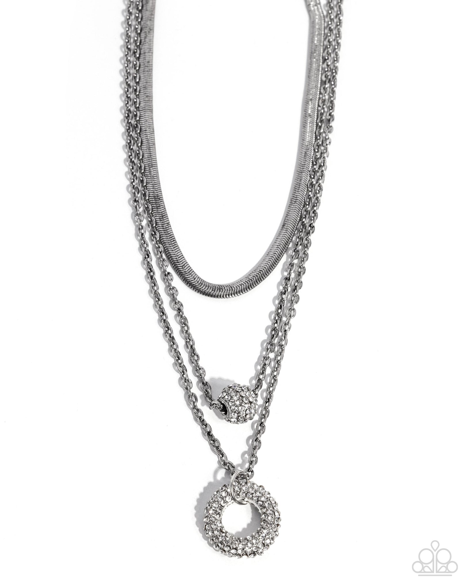 Three strands of dainty snake and cable silver chains fall into tiered layers as they cascade down the chest. Varying in dimension, a white rhinestone-adorned ornament and wreath are centered along the lowermost two chains creating a dizzying dominant display. Features an adjustable clasp closure.