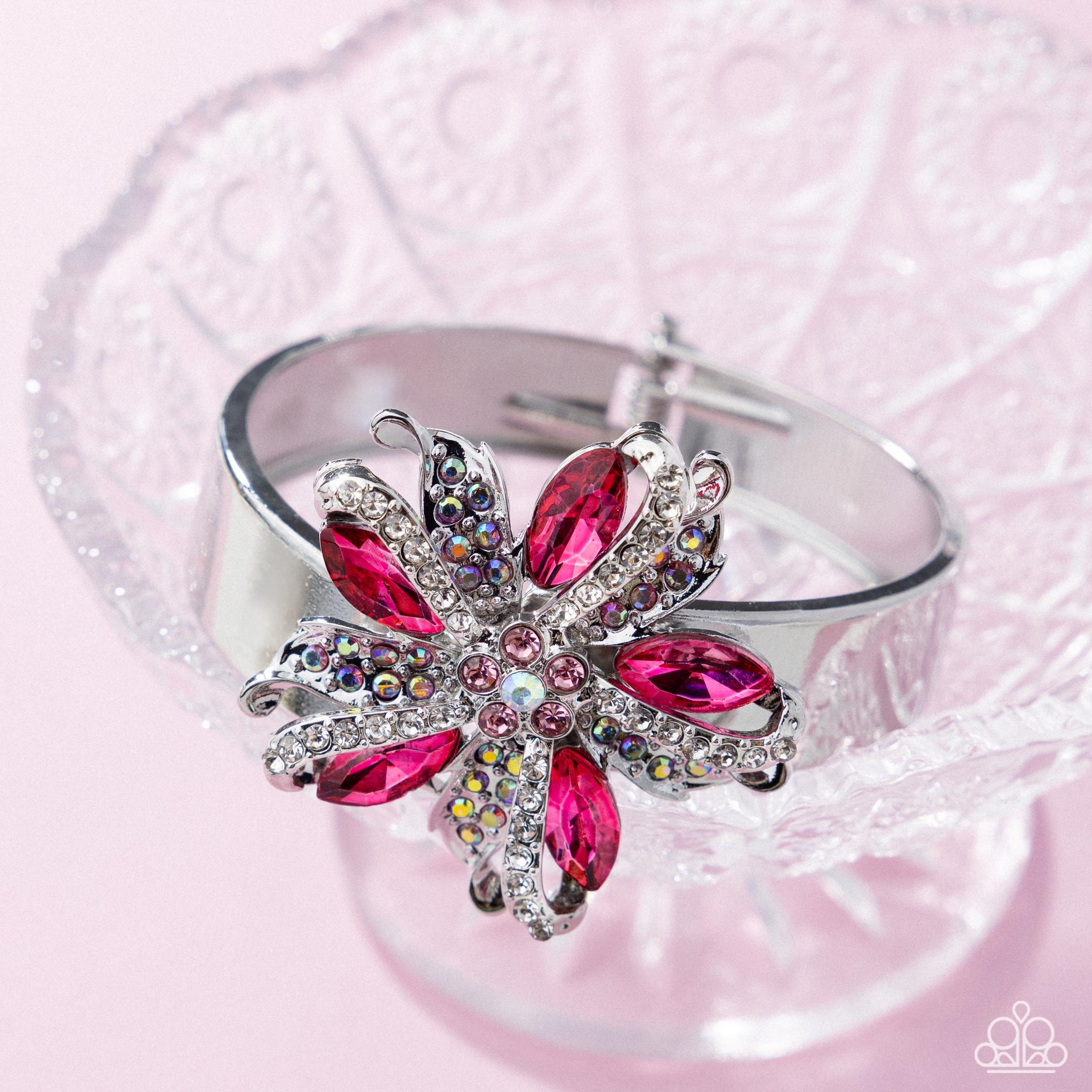 A dazzling collection of pink marquise-cut gems dramatically fan out between silver curls embellished in white and light rose iridescent rhinestones, creating an explosion of sparkle. The exaggerated gems circle into a floral centerpiece, blooming from a smaller floral centerpiece made up of an iridescent rhinestone center and light rose rhinestone petals that sit atop sleek silver bars that wrap around the wrist for a whimsical finish. Features a hinged closure. Due to its prismatic palette, color may vary.