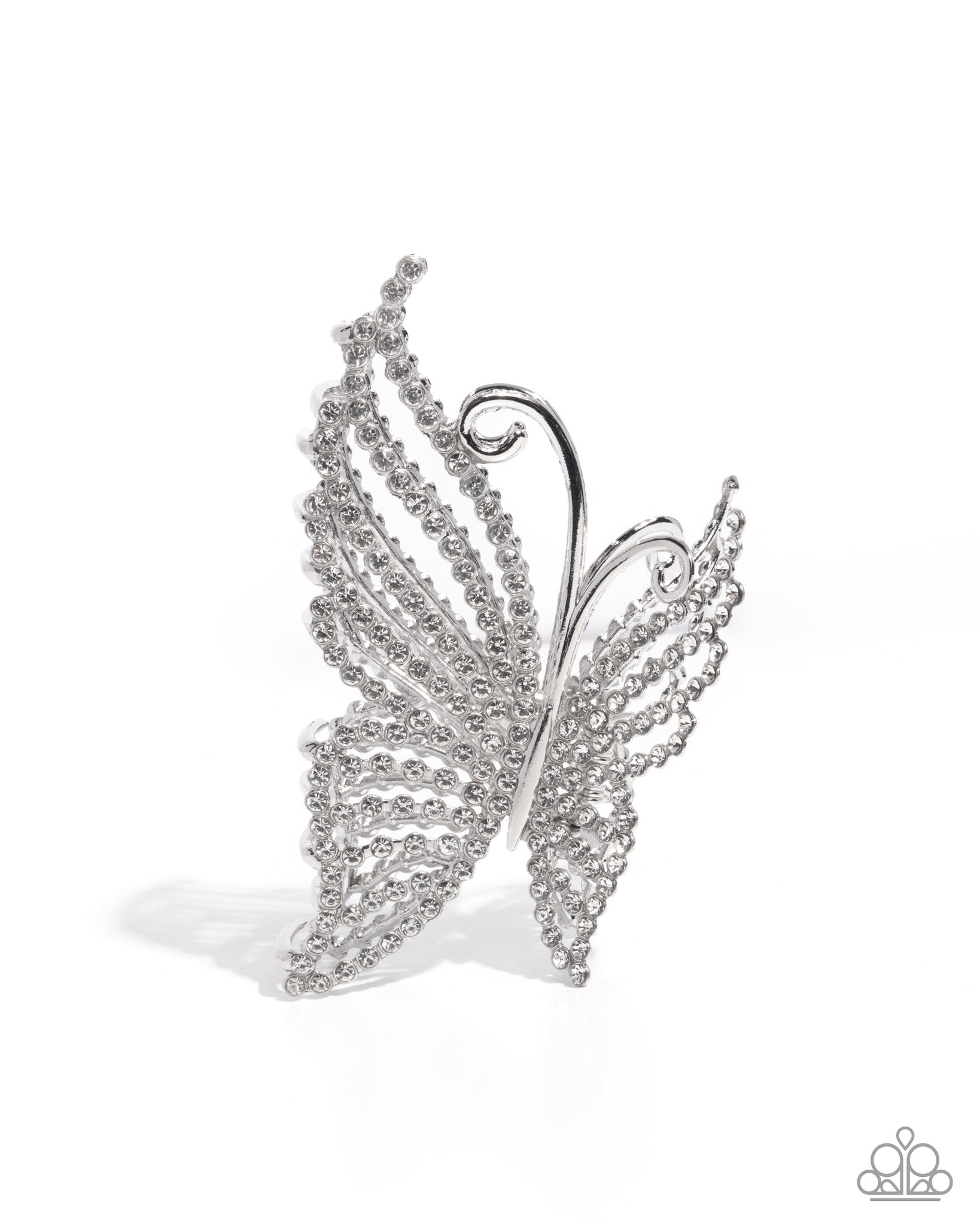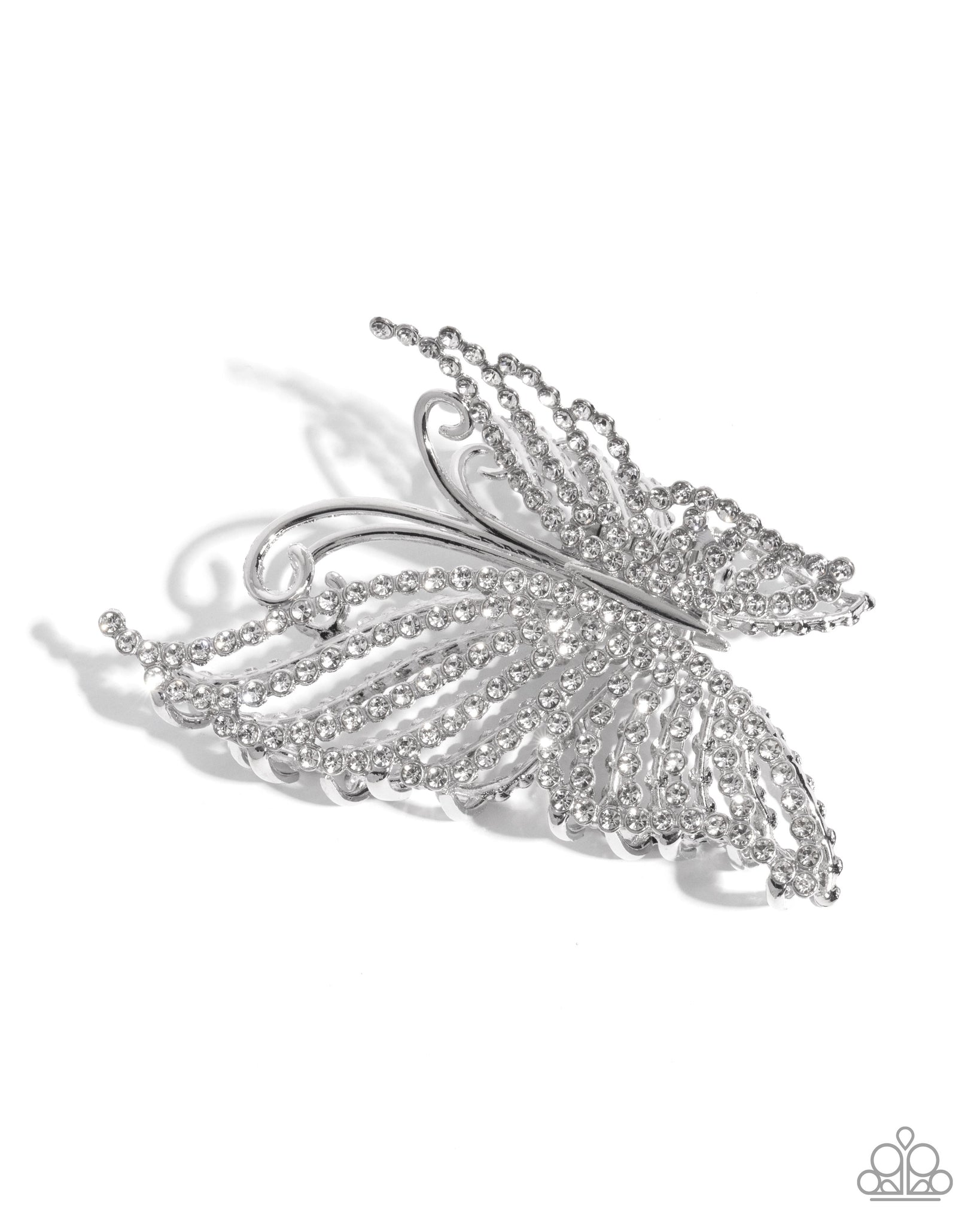 Featuring an explosion of white rhinestones, an airy silver butterfly clip holds the hair away from the face for an on-the-go chic display. Clip measures approximately 4" in length and 2" in width.