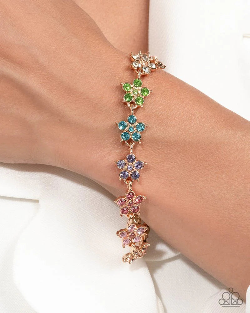 Featuring multicolored rhinestones in varying sizes, a collection of dainty gold-pronged flowers pattern and bloom around the neckline for a whimsical pop of color. Features an adjustable clasp closure.
