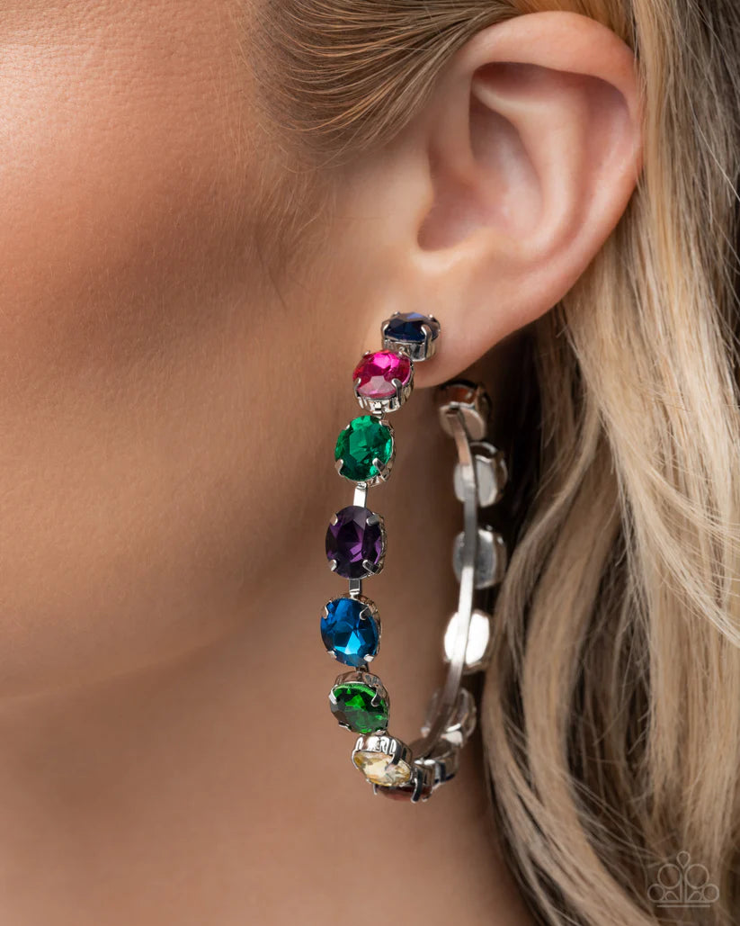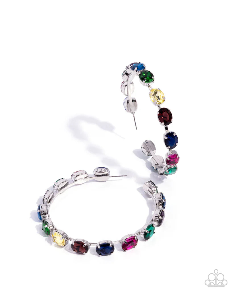 Pressed in pronged silver fittings, oval gems in multicolored finishes fall in line along a sleek bar of silver, creating a mesmerizing pop of color around the ear. Earring attaches to a standard post fitting. Hoop measures approximately 2 3/4" in diameter.