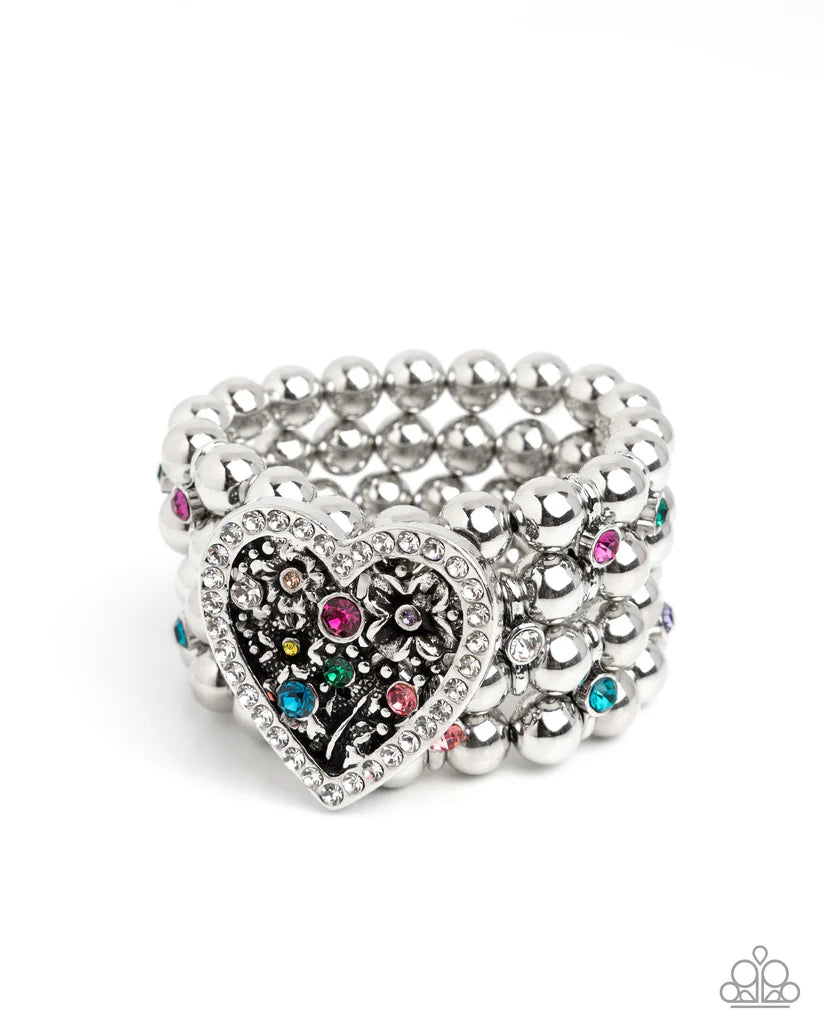 Strung along elastic stretchy bands, a quartet of glistening silver beads sporadically dotted with multicolored rhinestones wraps and stacks around the wrist. Featured atop the center of the beaded collection, a silver floral filigree-filled heart with additional multicolored rhinestone centers and details flare out from a mesmerizing white rhinestone-encrusted border for a heartfelt historic finish.